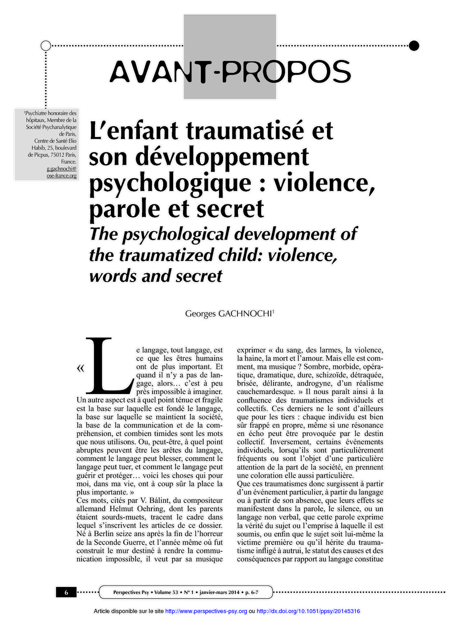 Avant-Propos : L’enfant traumatisé et son développement psychologique : violence, parole et secret